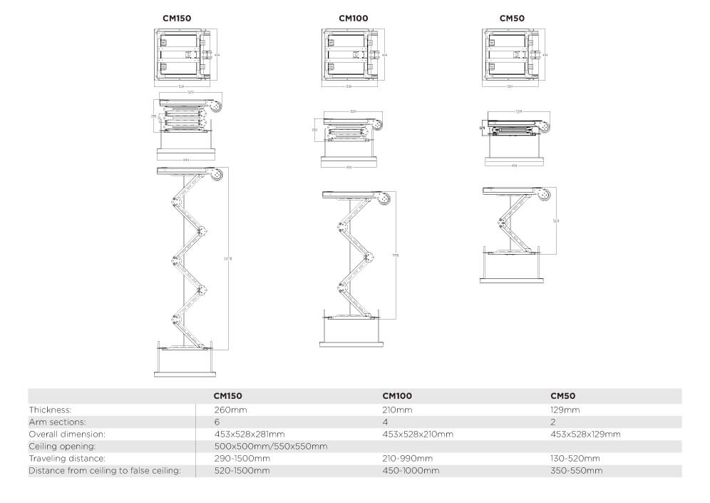 Different from the commonly-available scissors structure, CM series motorized projector lift is using a single-armed structure made from aluminum alloy, which can avoid the front- to-back and side-to-side swing problem. The anti-broken structure ensures the security of use. This series including three models CM50 CM100 CM150, customer could choose the proper lift according to the different ceilings. Besides these standard size, we could produce the lift as client’s customized requirement within 2 meters travel distance. The weight capacity is 40 kg. Patent No.CN205560196U
